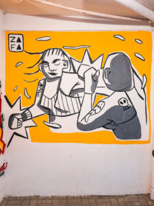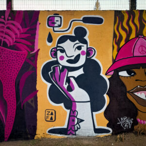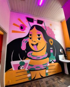Algo bastante marcante na minha trajetória foi a participação no programa para mulheres artistas WOW (Women on Walls), com três meses de aulas e vivências no campo das artes. No final do programa fui uma das três vencedoras para ilustrar uma sandália Ipanema, que é patrocinadora do WOW. Já tive trabalhos expostos em exposições coletivas tanto em Joinville quanto em Curitiba e hoje tenho uma obra no acervo da Caixa Cultural. Participei de festivais de arte em diversos estados como Paraná, Santa Catarina, Rio de Janeiro, Espírito Santo e Pernambuco. Gosto muito de feiras gráficas também, onde já pude vender meus trabalhos autorais em cidades como Joinville, Santa Maria, Curitiba, São Paulo e Brasília.
