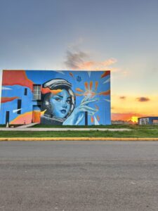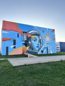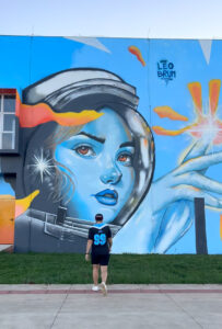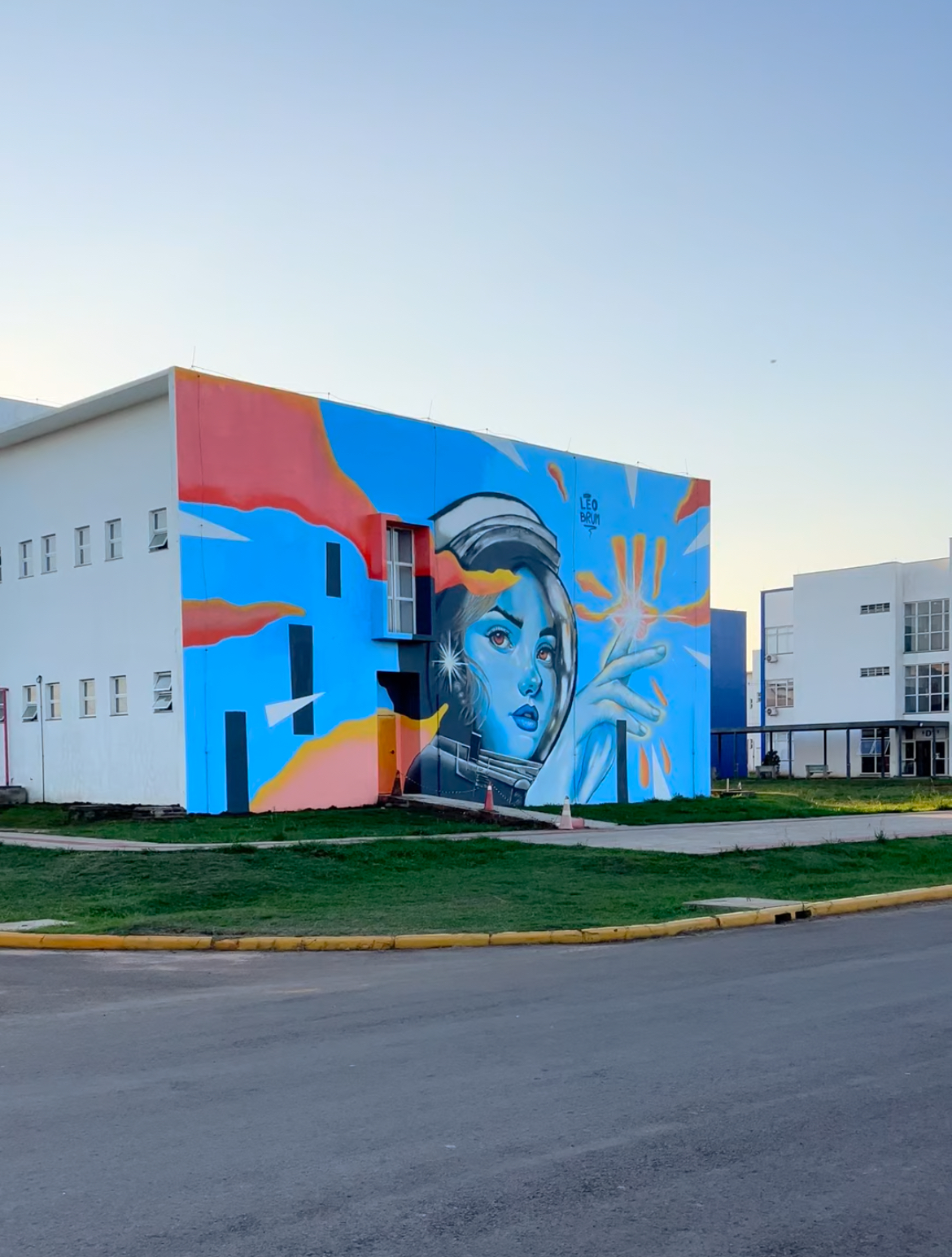 A arte representa o avanço tecnológico e a diversidade acadêmica, com a astronauta feminina em tons de azul que toca um ponto de luz que preenche a parede toda.A luz, é arte.