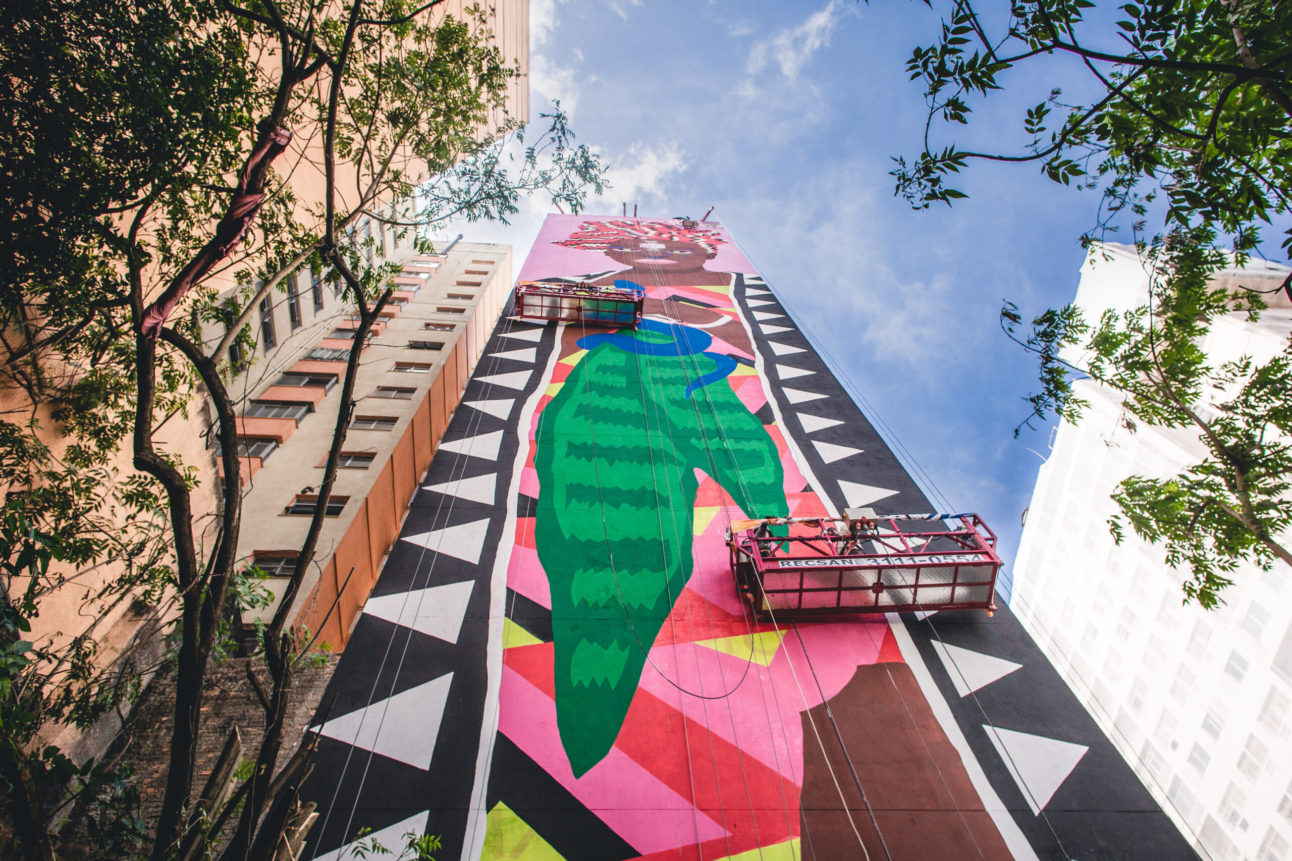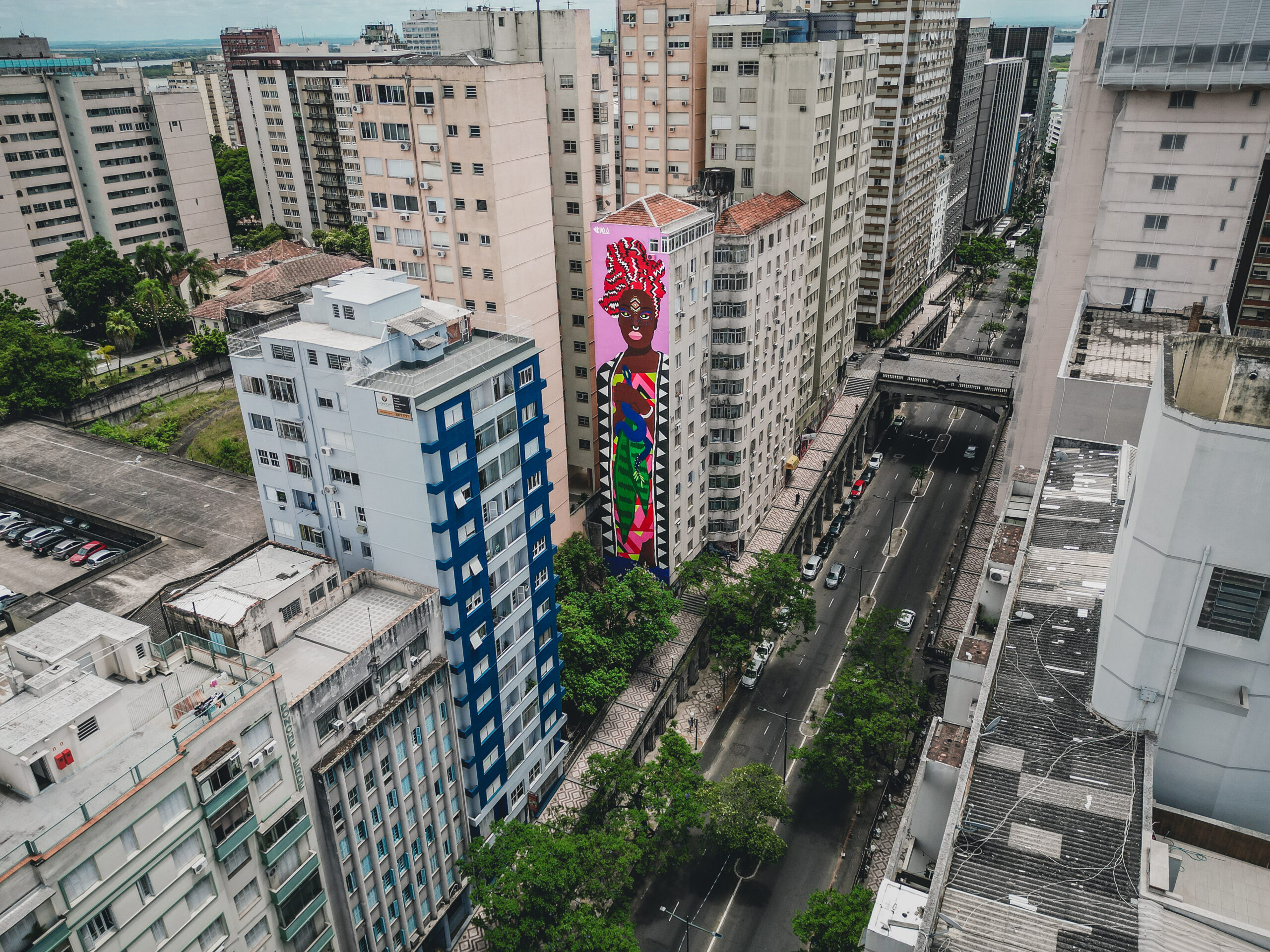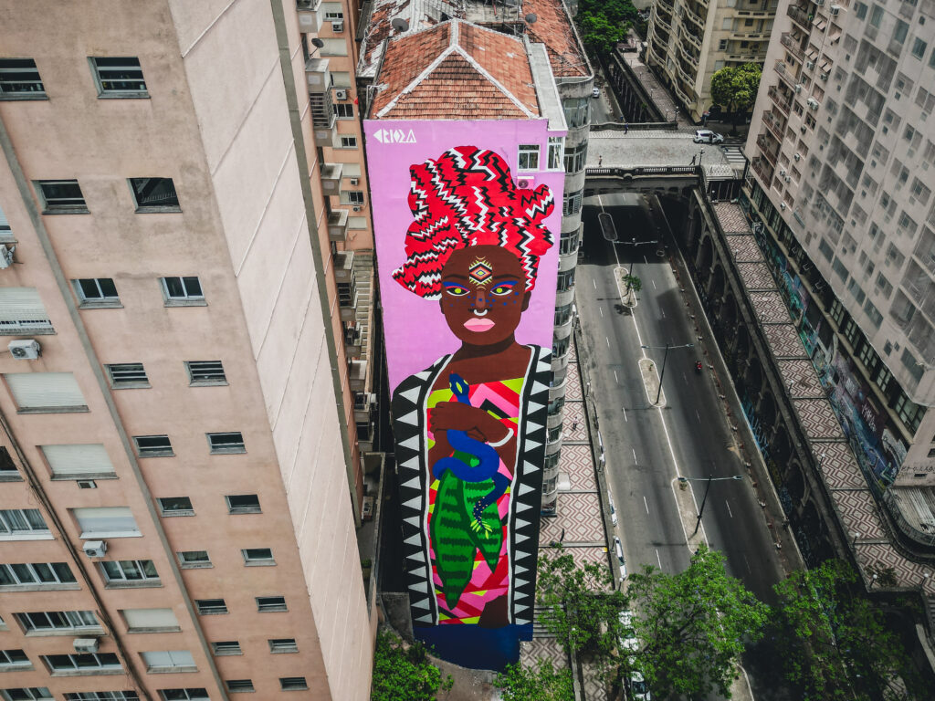 Meu nome é Criola, sou artista visual de Minas Gerais. Gosto muito de usar cores vibrantes, porque eu acredito que as cores, elas tem a potência e o poder de modificar o ambiente em que a gente vive. E quando a gente vê, tudo padronizado na cidade, cinza. O objetivo é justamente esse, não causar reflexões. Fazer com que você seja uma máquina. Só vai pra casa e pro trabalho. Eu acredito que a arte salva por causa disso. Eu quis pintar uma benzedeira gigante, no meio do centro de Porto Alegre. E ela está com esse turbante, com a cobra coral estampada representando a sua realeza. Eu acho que ter isso aqui em Porto Alegre, é importante marcar a presença das pessoas pretas neste lugar.