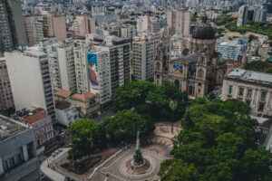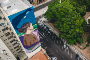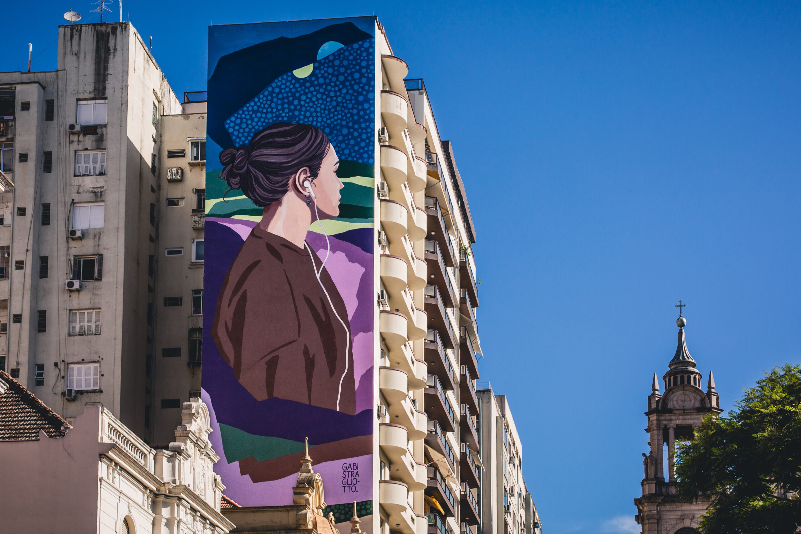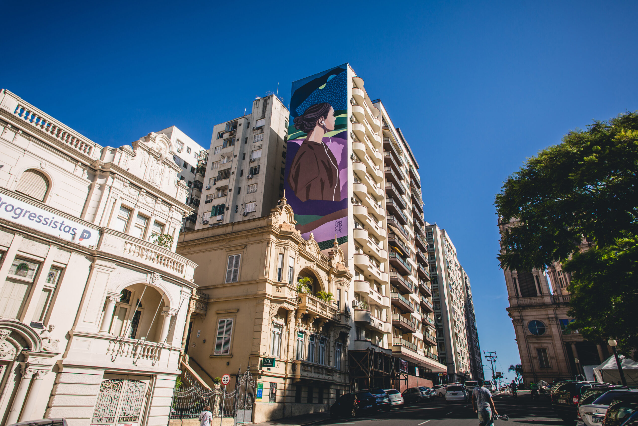 O mural Duas Luas é uma extensão da minha pesquisa no atelier, registrando imagens de pessoas nos centros urbanos e deslocando elas, através da pintura, para espaços abstratos que remetem à paisagens, a espaços mais amplos e mais calmos que os originais. Essas figuras, apesar de sempre se manterem desconhecidas, anônimas, buscam também uma sensação de proximidade, de intimidade com o espectador. É como se dividíssemos com ela a cena a frente, como se compartilhássemos aquele instante. Me interessa muito elaborar melhor a nossa percepção do tempo e do espaço na vida contemporânea - e esse assunto atravessa também esse trabalho. Podemos nos deslocar, mesmo que provisoriamente, para um outro tempo, mais sereno que a vida inquieta que caracteriza o nosso dia a dia?