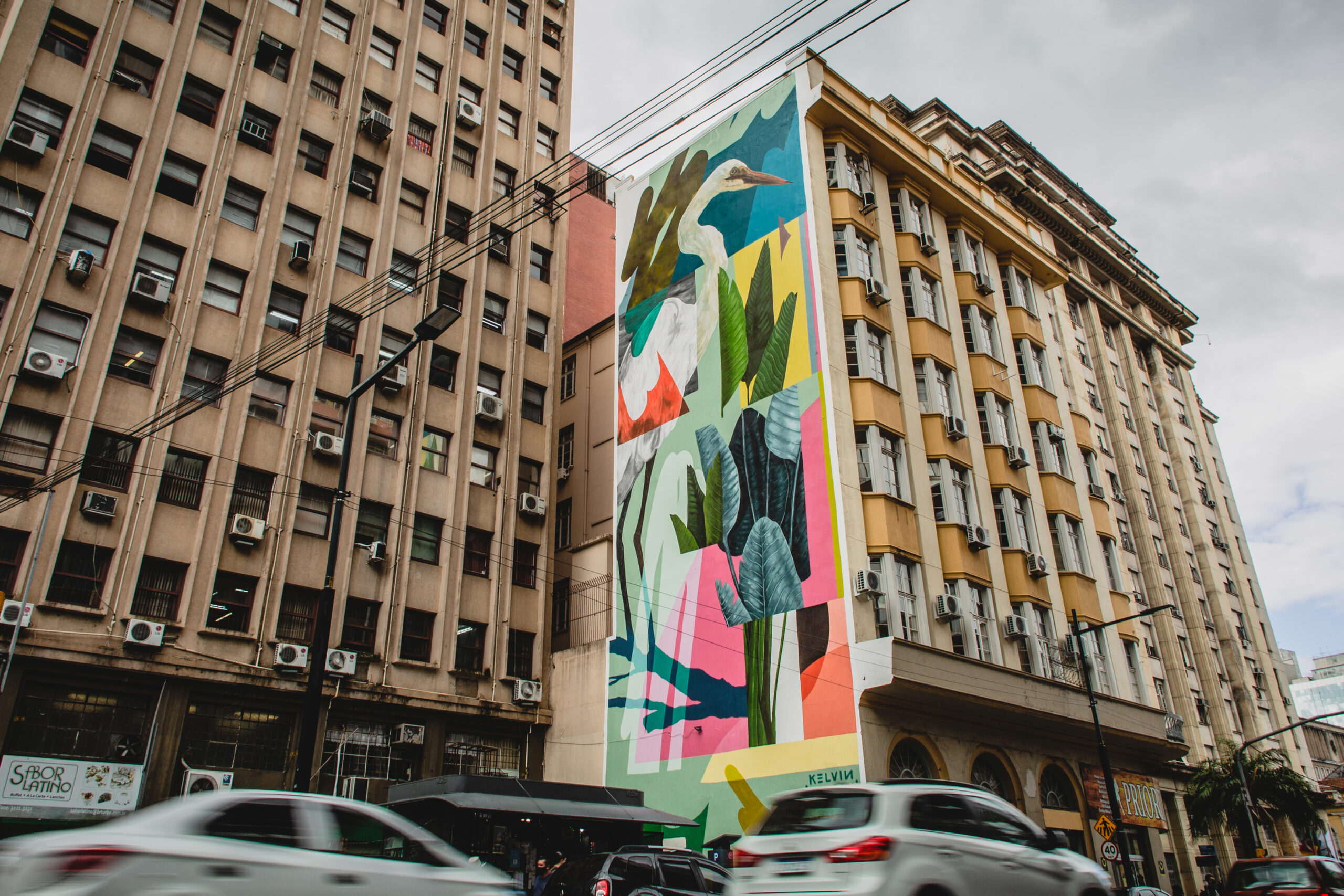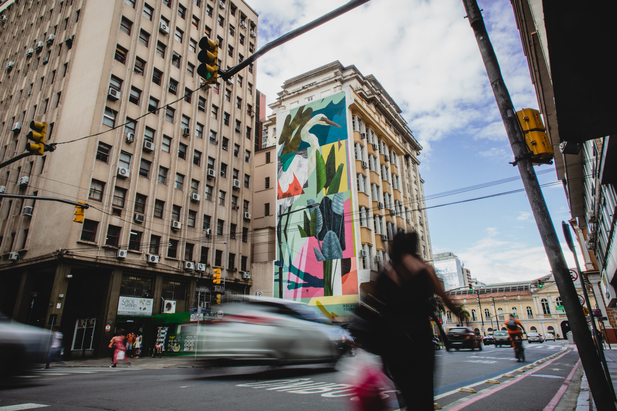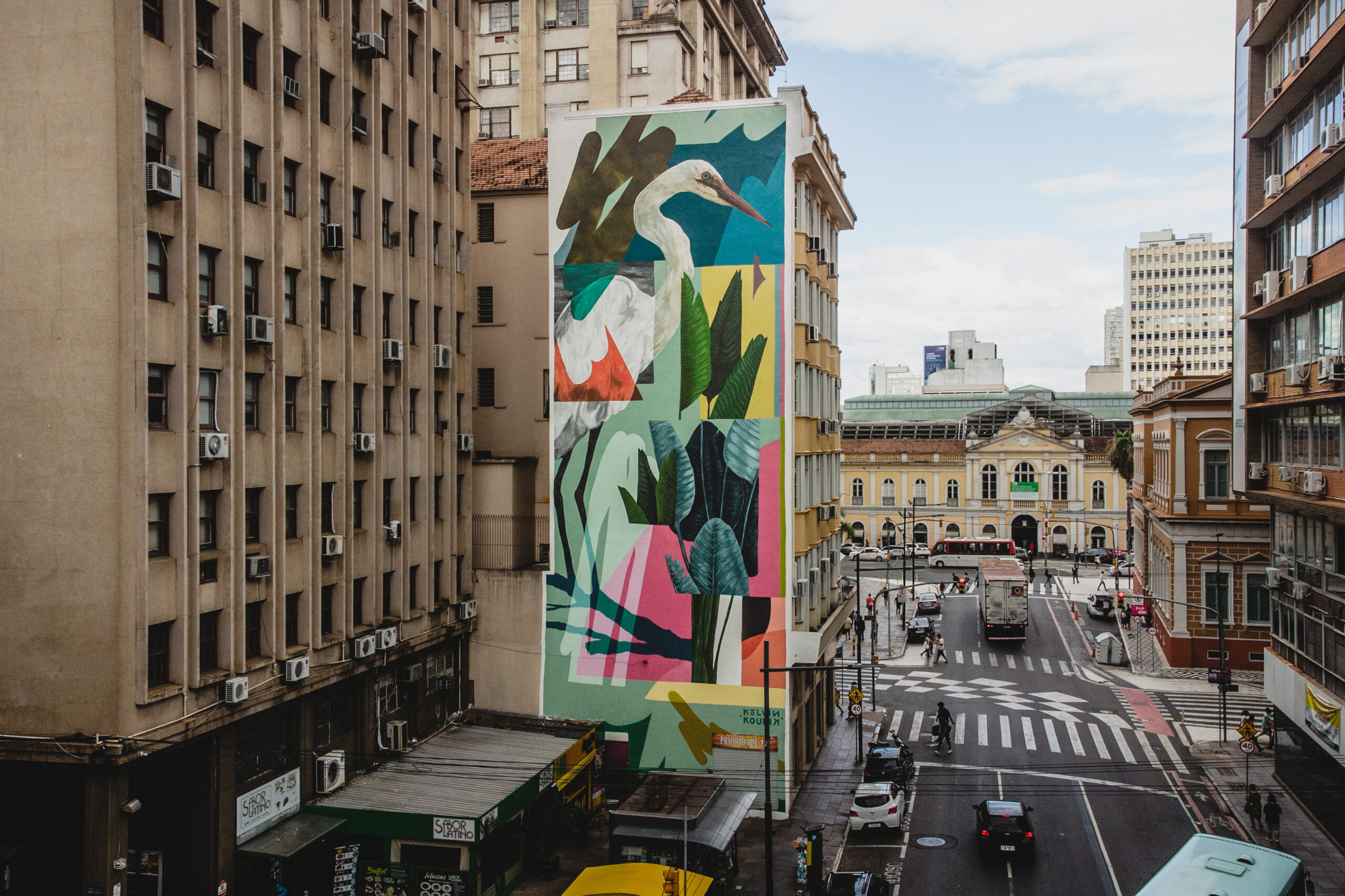 A obra "Quando a naturalidade se desloca", de Kelvin Koubik, parte da intenção do artista em quebrar o ritmo e a ordem dos elementos densos e pesados que constituem as paisagens urbanas das metrópoles, nesse caso o centro de Porto Alegre. Como naturalidade entendemos a ideia de qualidade, estado e/ou condição e que, na intervenção realizada pelo artista nos surge como efeito. Koubik neste mural, lança mão de um paradoxo que está entre dois tipos de paisagens, a urbana cinza e densa, e a da natureza, das mais diversas cores que a fauna e a flora apresentam. A garça, que para o artista traz memórias da capital gaúcha, junto do conjunto de folhagens sobrepostas em alguns planos, abrem espaço ao paradoxal, pois, na parede o que vemos é uma paisagem artificial, trata-se de uma natureza morta, mas, o que está em jogo é o o deslocamento do campo das ideias enquanto processo artístico. A natureza, ainda que morta ou artificial enquanto pintura, dá vida enquanto dispositivo. Entre as sobreposições dos tons de cinza e as linhas ortogonais dos prédios da Rua Siqueira Campos vemos a pintura de Koubik nascer com leveza e organicidade, como uma vegetação que brota do solo. Texto: Santiago Pooter